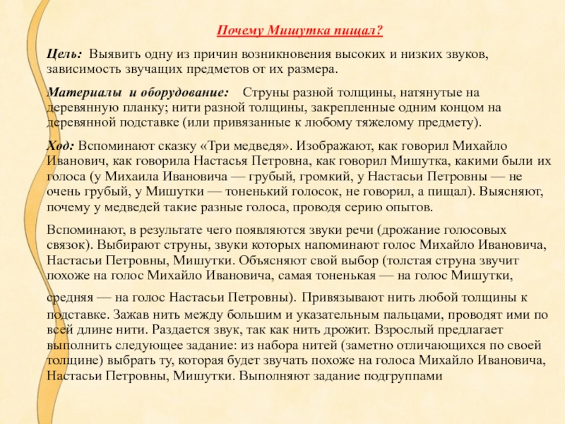 Ход: Вспоминают сказку «Три медведя». Изображают, как говорил Михайло Иванович, как говорила Настасья Петровна, как говорил Мишутка, какими были их голоса (у Михаила Ивановича — грубый, громкий, у Настасьи Петровны — не очень грубый, у Мишутки — тоненький голосок, не говорил, а пищал). Выясняют, почему у медведей такие разные голоса, проводя серию опытов.