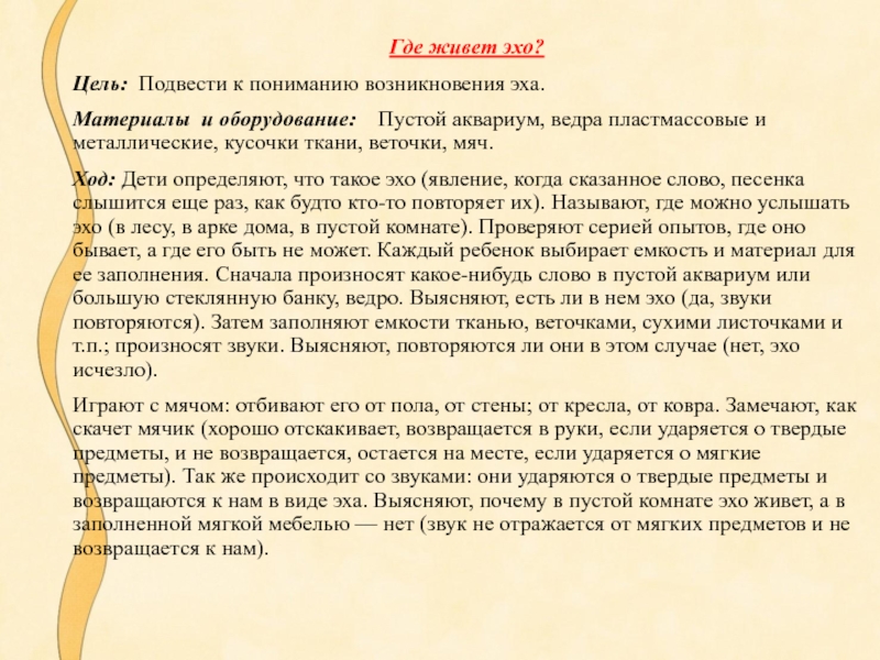 Ход: Дети определяют, что такое эхо (явление, когда сказанное слово, песенка слышится еще раз, как будто кто-то повторяет их). Называют, где можно услышать эхо (в лесу, в арке дома, в пустой комнате). Проверяют серией опытов, где оно бывает, а где его быть не может. Каждый ребенок выбирает емкость и материал для ее заполнения. Сначала произносят какое-нибудь слово в пустой аквариум или большую стеклянную банку, ведро. Выясняют, есть ли в нем эхо (да, звуки повторяются). Затем заполняют емкости тканью, веточками, сухими листочками и т.п.; произносят звуки. Выясняют, повторяются ли они в этом случае (нет, эхо исчезло).