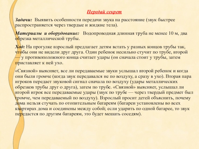 Ход: На прогулке взрослый предлагает детям встать у разных концов трубы так, чтобы они не видели друг друга. Один ребенок несильно стучит по трубе, второй — у противоположного конца считает удары (он сначала стоит у трубы, затем приставляет к ней ухо.