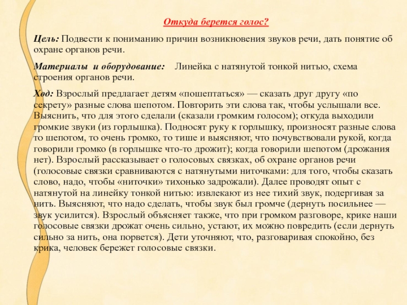 Ход: Взрослый предлагает детям «пошептаться» — сказать друг другу «по секрету» разные слова шепотом. Повторить эти слова так, чтобы услышали все. Выяснить, что для этого сделали (сказали громким голосом); откуда выходили громкие звуки (из горлышка). Подносят руку к горлышку, произносят разные слова то шепотом, то очень громко, то тише и выясняют, что почувствовали рукой, когда говорили громко (в горлышке что-то дрожит); когда говорили шепотом (дрожания нет). Взрослый рассказывает о голосовых связках, об охране органов речи (голосовые связки сравниваются с натянутыми ниточками: для того, чтобы сказать слово, надо, чтобы «ниточки» тихонько задрожали). Далее проводят опыт с натянутой на линейку тонкой нитью: извлекают из нее тихий звук, подергивая за нить. Выясняют, что надо сделать, чтобы звук был громче (дернуть посильнее — звук усилится). Взрослый объясняет также, что при громком разговоре, крике наши голосовые связки дрожат очень сильно, устают, их можно повредить (если дернуть сильно за нить, она порвется). Дети уточняют, что, разговаривая спокойно, без крика, человек бережет голосовые связки.