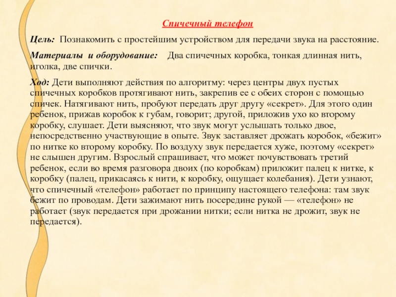 Ход: Дети выполняют действия по алгоритму: через центры двух пустых спичечных коробков протягивают нить, закрепив ее с обеих сторон с помощью спичек. Натягивают нить, пробуют передать друг другу «секрет». Для этого один ребенок, прижав коробок к губам, говорит; другой, приложив ухо ко второму коробку, слушает. Дети выясняют, что звук могут услышать только двое, непосредственно участвующие в опыте. Звук заставляет дрожать коробок, «бежит» по нитке ко второму коробку. По воздуху звук передается хуже, поэтому «секрет» не слышен другим. Взрослый спрашивает, что может почувствовать третий ребенок, если во время разговора двоих (по коробкам) приложит палец к нитке, к коробку (палец, прикасаясь к нити, к коробку, ощущает колебания). Дети узнают, что спичечный «телефон» работает по принципу настоящего телефона: там звук бежит по проводам. Дети зажимают нить посередине рукой — «телефон» не работает (звук передается при дрожании нитки; если нитка не дрожит, звук не передается).