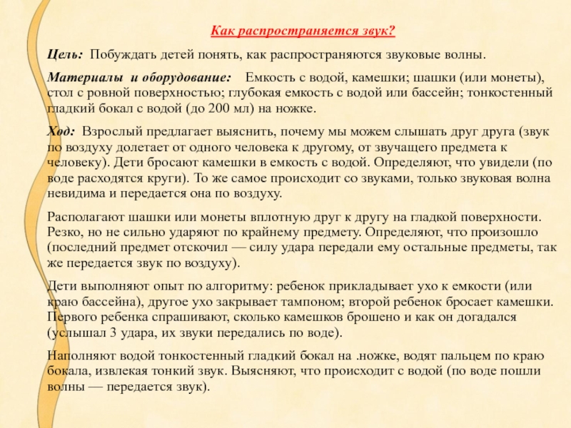 Ход: Взрослый предлагает выяснить, почему мы можем слышать друг друга (звук по воздуху долетает от одного человека к другому, от звучащего предмета к человеку). Дети бросают камешки в емкость с водой. Определяют, что увидели (по воде расходятся круги). То же самое происходит со звуками, только звуковая волна невидима и передается она по воздуху.