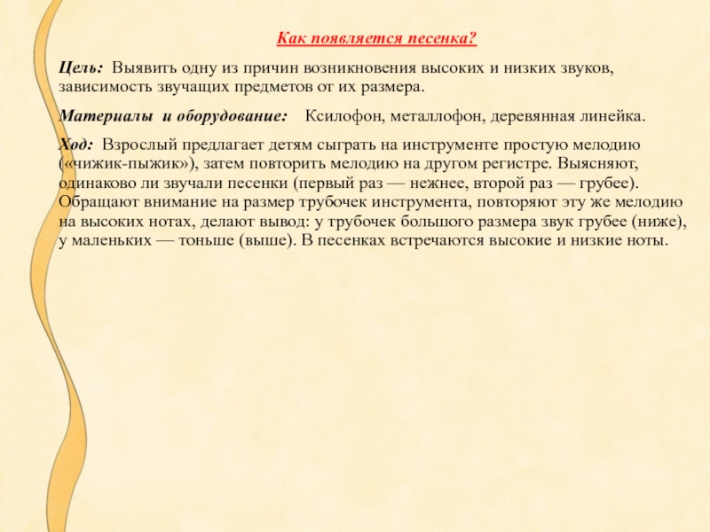 Ход: Взрослый предлагает детям сыграть на инструменте простую мелодию («чижик-пыжик»), затем повторить мелодию на другом регистре. Выясняют, одинаково ли звучали песенки (первый раз — нежнее, второй раз — грубее). Обращают внимание на размер трубочек инструмента, повторяют эту же мелодию на высоких нотах, делают вывод: у трубочек большого размера звук грубее (ниже), у маленьких — тоньше (выше). В песенках встречаются высокие и низкие ноты.