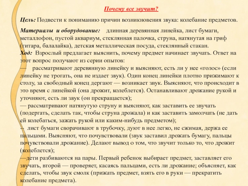Ход: Взрослый предлагает выяснить, почему предмет начинает звучать. Ответ на этот вопрос получают из серии опытов: