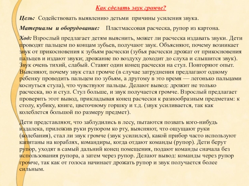 Ход: Взрослый предлагает детям выяснить, может ли расческа издавать звуки. Дети проводят пальцем по концам зубьев, получают звук. Объясняют, почему возникает звук от прикосновения к зубьям расчески (зубья расчески дрожат от прикосновения пальцев и издают звуки; дрожание по воздуху доходит до слуха и слышится звук). Звук очень тихий, слабый. Ставят один конец расчески на стул. Повторяют опыт. Выясняют, почему звук стал громче (в случае затруднения предлагают одному ребенку проводить пальцем по зубьям, а другому в это время — легонько пальцами коснуться стула), что чувствуют пальцы. Делают вывод: дрожит не только расческа, но и стул. Стул больше, и звук получается громче. Взрослый предлагает проверить этот вывод, прикладывая конец расчески к разнообразным предметам: к столу, кубику, книге, цветочному горшку и т.д. (звук усиливается, так как колеблется большой по размеру предмет).