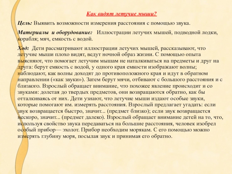 Ход: Дети рассматривают иллюстрации летучих мышей, рассказывают, что летучие мыши плохо видят, ведут ночной образ жизни. С помощью опыта выясняют, что помогает летучим мышам не наталкиваться на предметы и друг на друга: берут емкость с водой, у одного края емкости изображают волны; наблюдают, как волны доходят до противоположного края и идут в обратном направлении («как звуки»). Затем берут мячи, отбивают с большого расстояния и с близкого. Взрослый обращает внимание, что похожее явление происходит и со звуками: долетая до твердых предметов, они возвращаются обратно, как бы отталкиваясь от них. Дети узнают, что летучие мыши издают особые звуки, которые помогают им. измерять расстояния. Взрослый предлагает угадать: если звук возвращается быстро, значит... (предмет близко); если звук возвращается нескоро, значит... (предмет далеко). Взрослый обращает внимание детей на то, что, используя свойство звука передаваться на большие расстояния, человек изобрел особый прибор— эхолот. Прибор необходим морякам. С его помощью можно измерять глубину моря, посылая звук и принимая его обратно.