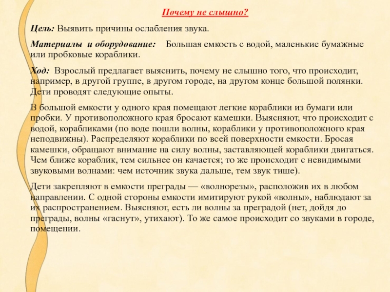 Ход: Взрослый предлагает выяснить, почему не слышно того, что происходит, например, в другой группе, в другом городе, на другом конце большой полянки. Дети проводят следующие опыты.