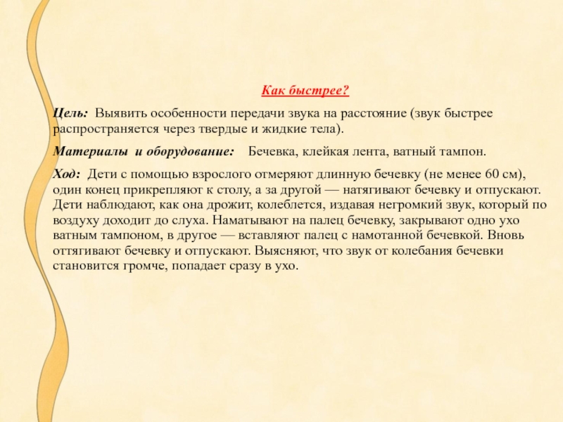 Ход: Дети с помощью взрослого отмеряют длинную бечевку (не менее 60 см), один конец прикрепляют к столу, а за другой — натягивают бечевку и отпускают. Дети наблюдают, как она дрожит, колеблется, издавая негромкий звук, который по воздуху доходит до слуха. Наматывают на палец бечевку, закрывают одно ухо ватным тампоном, в другое — вставляют палец с намотанной бечевкой. Вновь оттягивают бечевку и отпускают. Выясняют, что звук от колебания бечевки становится громче, попадает сразу в ухо.