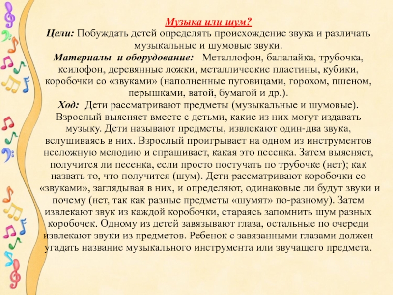 Ход: Дети рассматривают предметы (музыкальные и шумовые). Взрослый выясняет вместе с детьми, какие из них могут издавать музыку. Дети называют предметы, извлекают один-два звука, вслушиваясь в них. Взрослый проигрывает на одном из инструментов несложную мелодию и спрашивает, какая это песенка. Затем выясняет, получится ли песенка, если просто постучать по трубочке (нет); как назвать то, что получится (шум). Дети рассматривают коробочки со «звуками», заглядывая в них, и определяют, одинаковые ли будут звуки и почему (нет, так как разные предметы «шумят» по-разному). Затем извлекают звук из каждой коробочки, стараясь запомнить шум разных коробочек. Одному из детей завязывают глаза, остальные по очереди извлекают звуки из предметов. Ребенок с завязанными глазами должен угадать название музыкального инструмента или звучащего предмета.