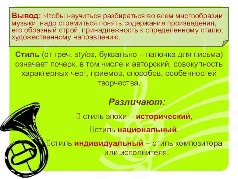 Вывод: Чтобы научиться разбираться во всем многообразии музыки, надо стремиться понять содержание произведения, его образный строй, принадлежность к определенному стилю, художественному направлению.