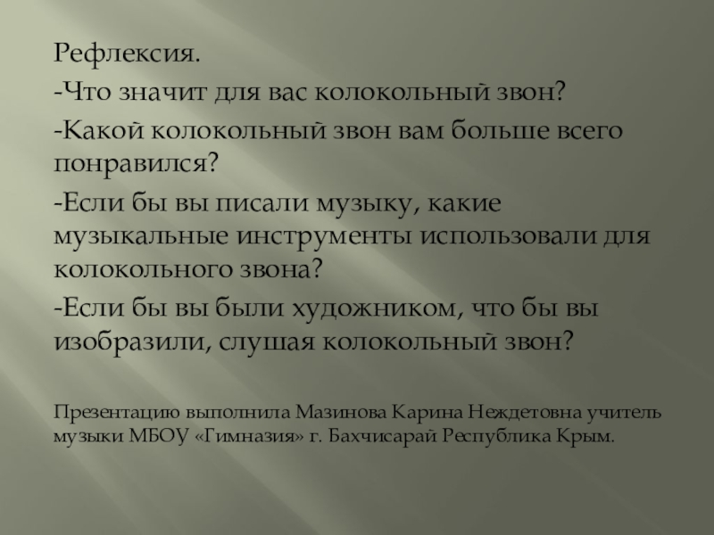 Рефлексия.-Что значит для вас колокольный звон?-Какой колокольный звон вам больше всего понравился?-Если бы вы писали музыку, какие