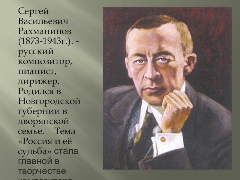 Слайд 6Сергей Васильевич Рахманинов (1873-1943г.). -русский композитор, пианист, дирижер. Родился в Новгородской