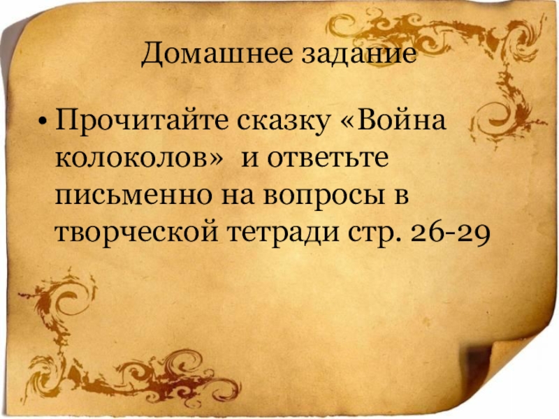 Домашнее заданиеПрочитайте сказку «Война колоколов» и ответьте письменно на вопросы в творческой тетради стр. 26-29