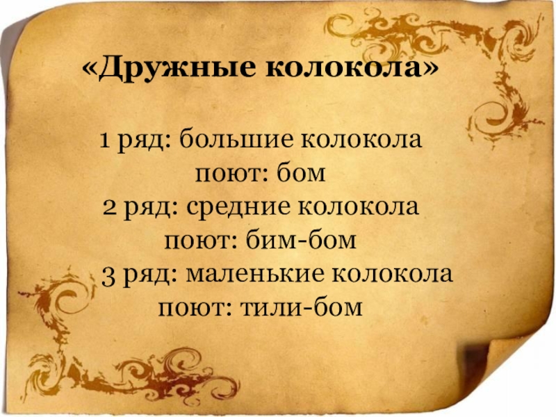 «Дружные колокола»1 ряд: большие колокола поют: бом2 ряд: средние колокола поют: бим-бом   3 ряд: маленькие