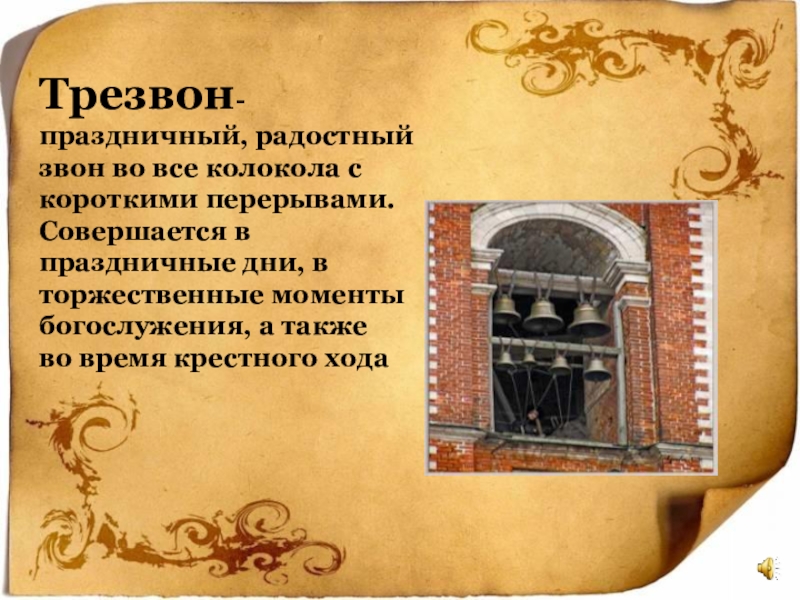 Слайд 10Трезвон-праздничный, радостный звон во все колокола с короткими перерывами.