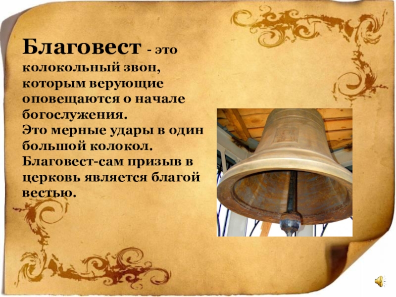 мерные удары в один большой колокол. Благовест-сам призыв в церковь является благой вестью.