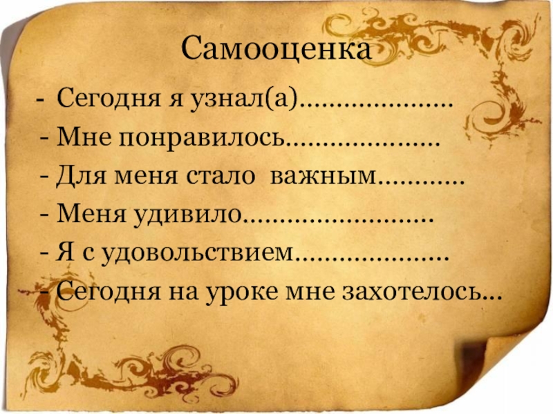 Самооценка- Сегодня я узнал(а)…………………Мне понравилось…………………Для меня стало важным…………Меня удивило……………………..Я с удовольствием………………...Сегодня на уроке мне захотелось...