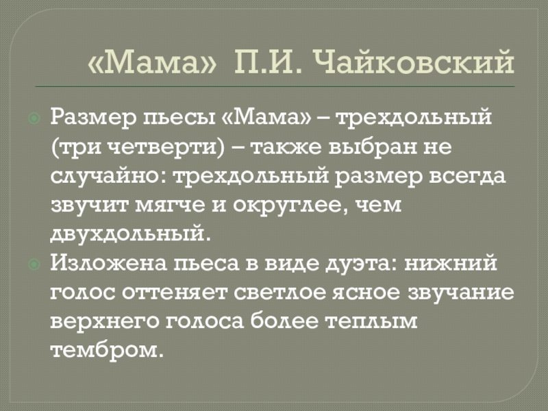 «Мама» П.И. ЧайковскийРазмер пьесы «Мама» – трехдольный (три четверти) – также выбран не случайно: трехдольный размер всегда