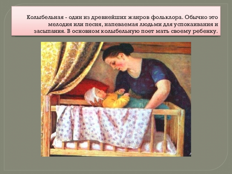 Слайд 2Колыбельная - один из древнейших жанров фольклора. Обычно это мелодия или