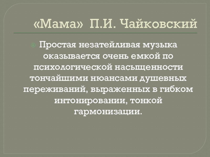 «Мама» П.И. ЧайковскийПростая незатейливая музыка оказывается очень емкой по психологической насыщенности тончайшими нюансами душевных переживаний, выраженных в