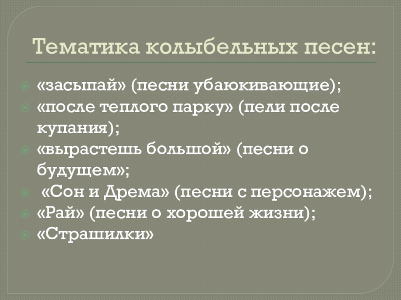 Тематика колыбельных песен:«засыпай» (песни убаюкивающие);«после теплого парку» (пели после купания);«вырастешь большой» (песни о будущем»; «Сон и Дрема»