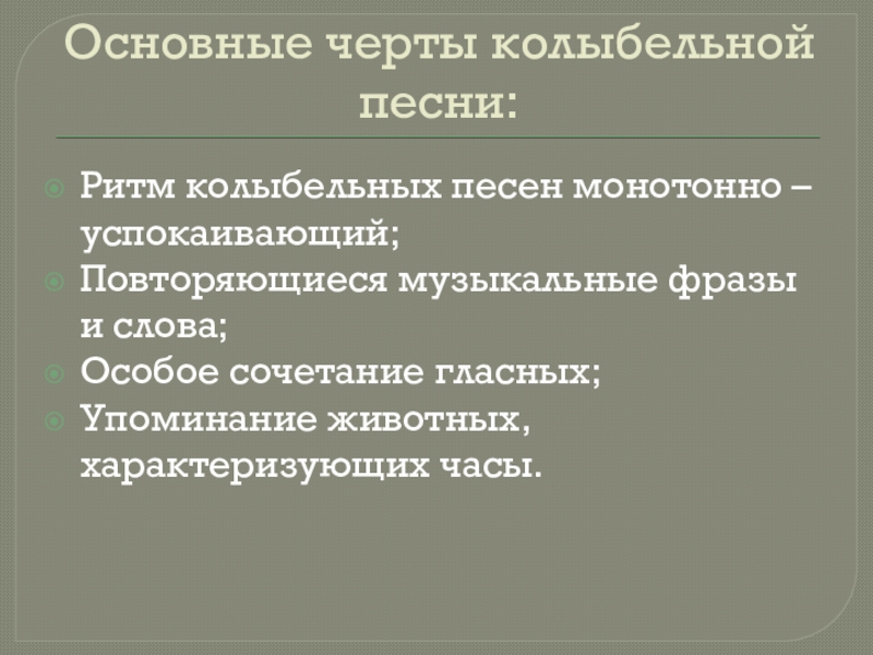 Основные черты колыбельной песни:Ритм колыбельных песен монотонно – успокаивающий;Повторяющиеся музыкальные фразы и слова;Особое сочетание гласных;Упоминание животных, характеризующих