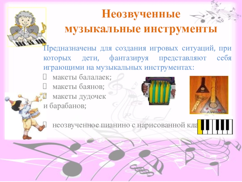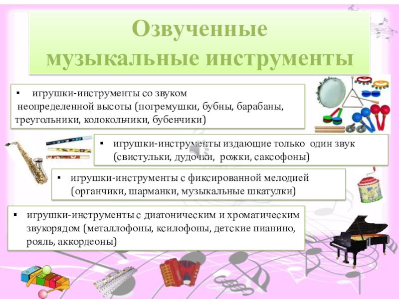 игрушки-инструменты с диатоническим и хроматическим звукорядом (металлофоны, ксилофоны, детские пианино, рояль, аккордеоны)