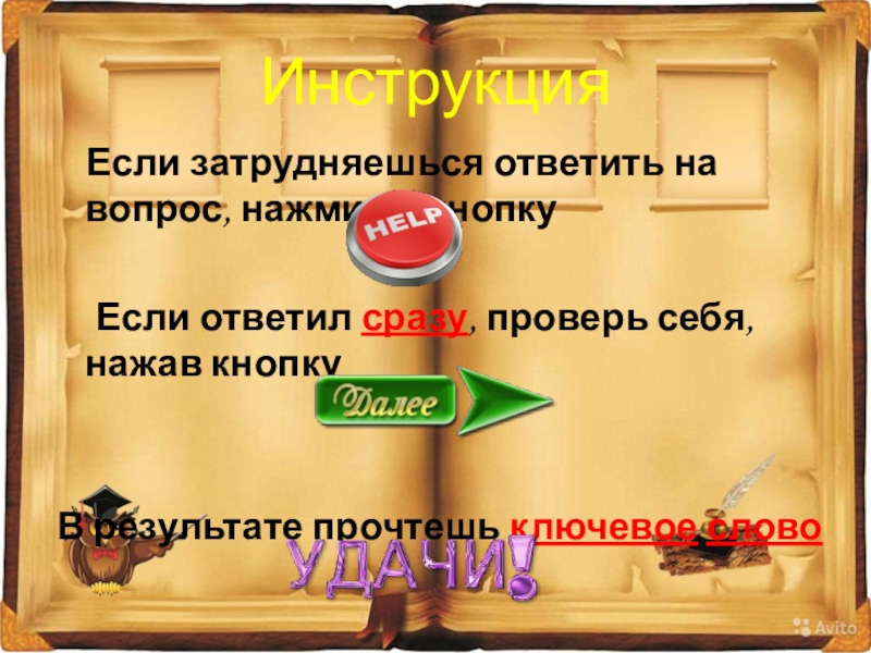 Инструкция   Если затрудняешься ответить на вопрос, нажми на кнопку	Если ответил сразу, проверь себя, нажав кнопку		В