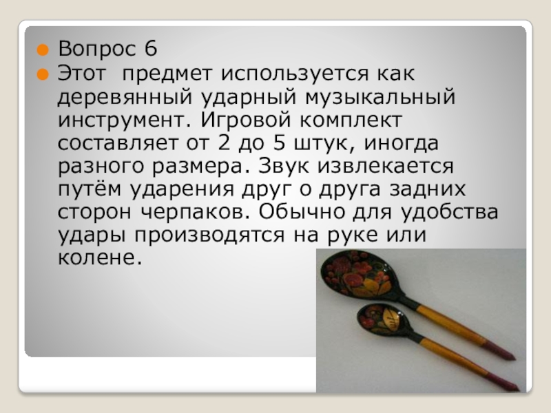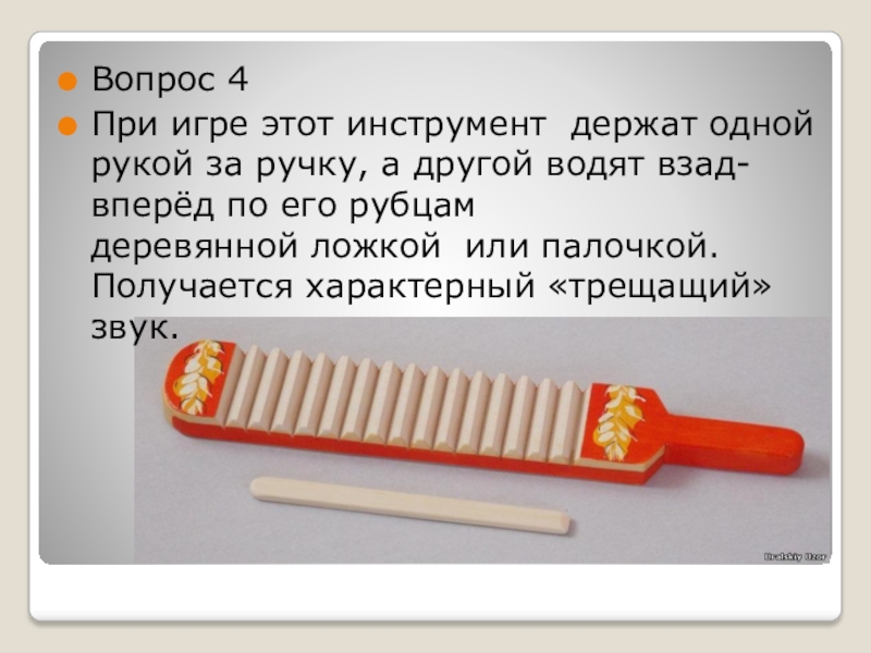 Старинный русский шумовой музыкальный инструмент. Возможно, на нём играли ещё