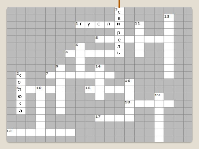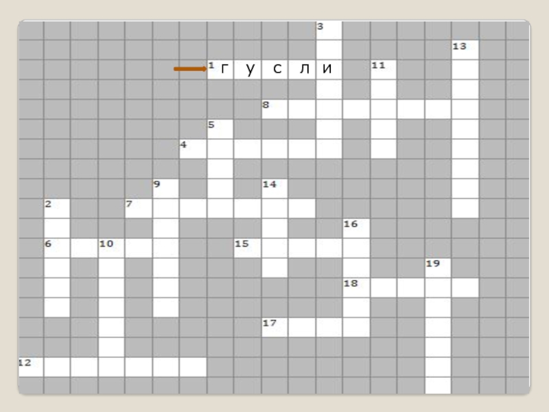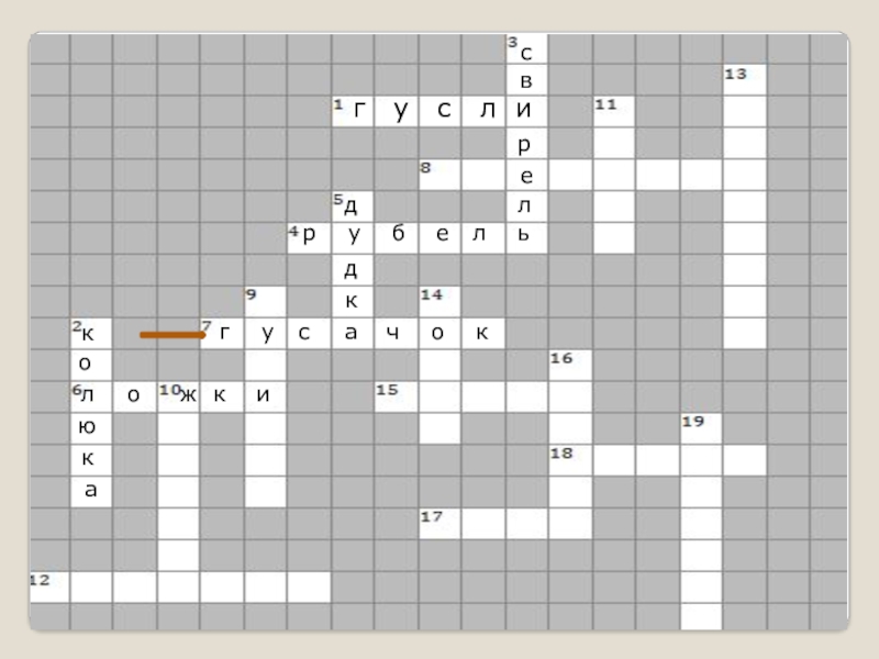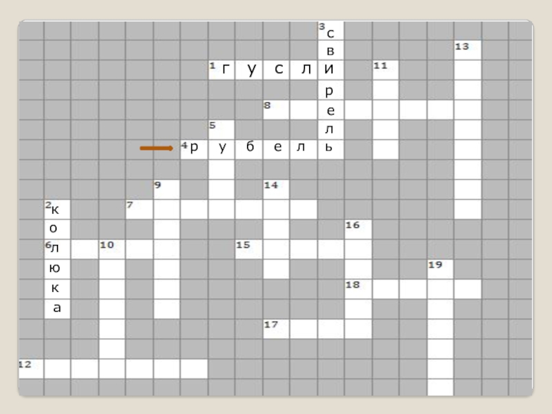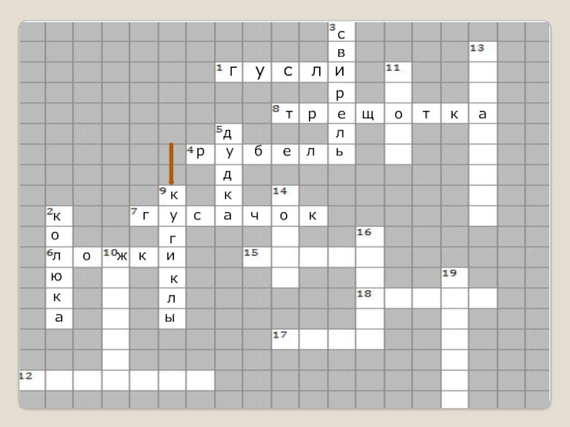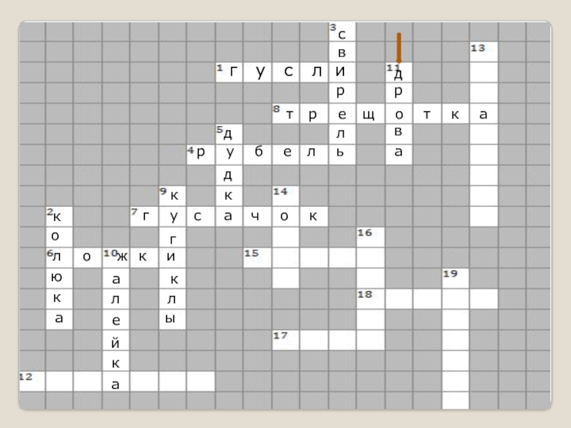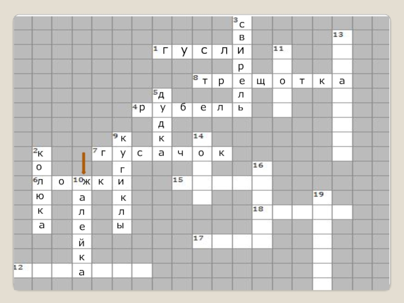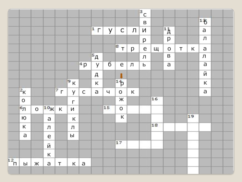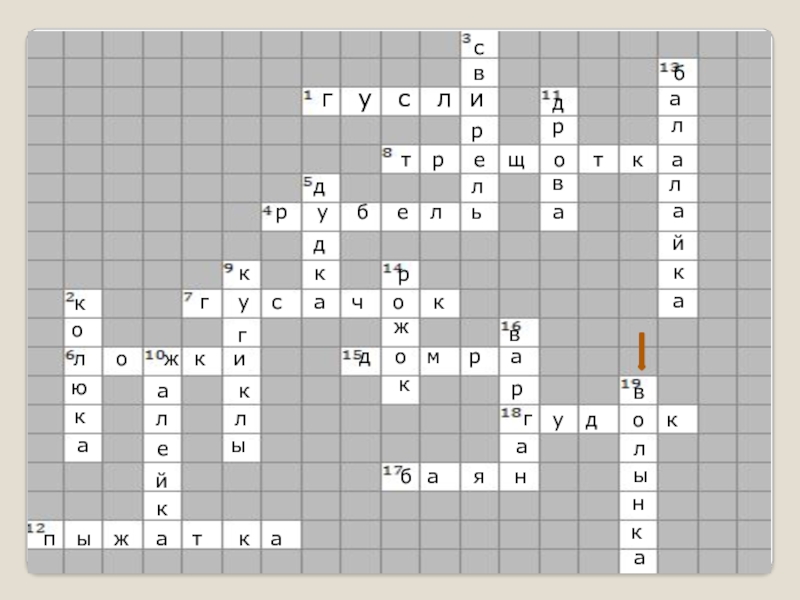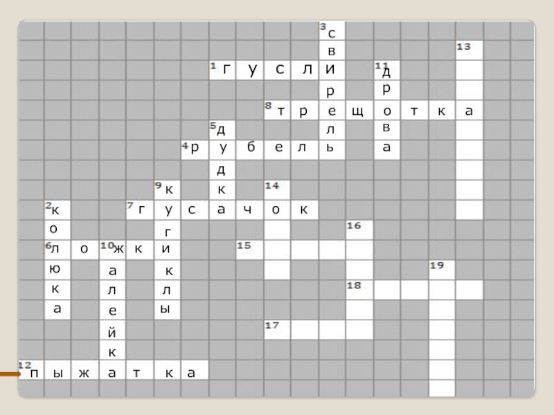 на первых двух слайдах. Смена слайдов производится нажатием на пробел (или по щелчку). При последующем щелчке происходит появление картинок, скелета кроссворда и правильного ответа.