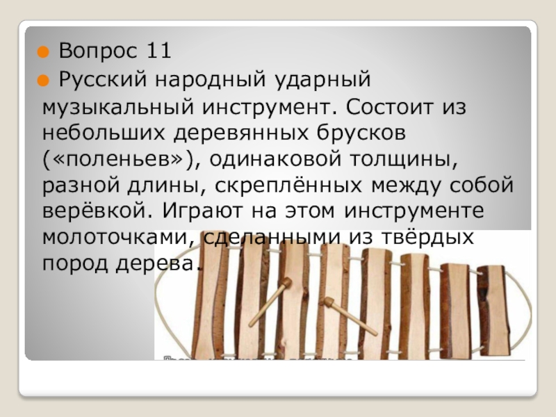 музыкальный инструмент. Состоит из небольших деревянных брусков («поленьев»), одинаковой