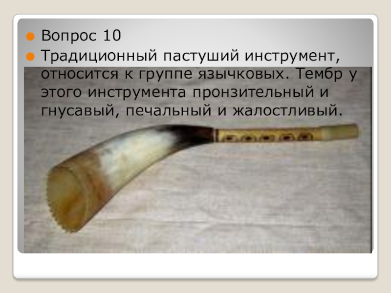 Традиционный пастуший инструмент, относится к группе язычковых. Тембр у этого