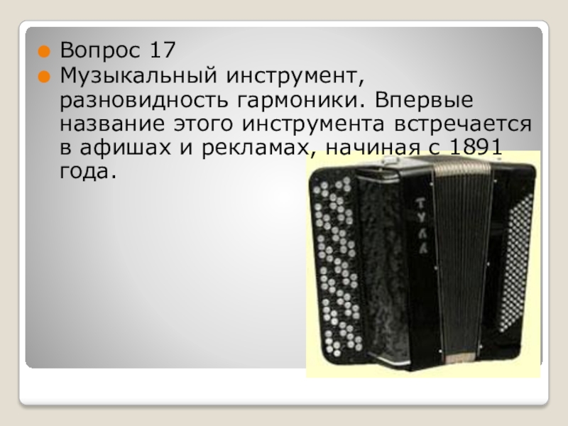 Музыкальный инструмент, разновидность гармоники. Впервые название этого инструмента встречается в