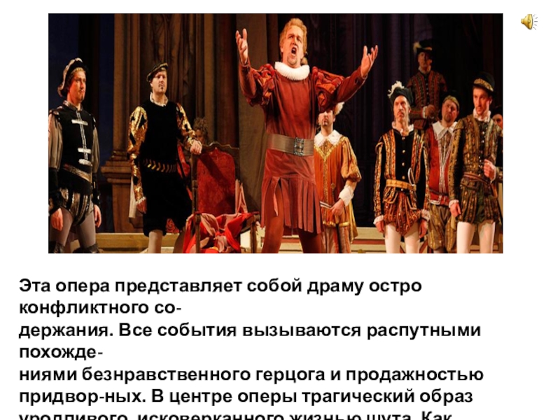 Эта опера представляет собой драму остро конфликтного со-держания. Все события вызываются распутными похожде-ниями безнравственного герцога и продажностью