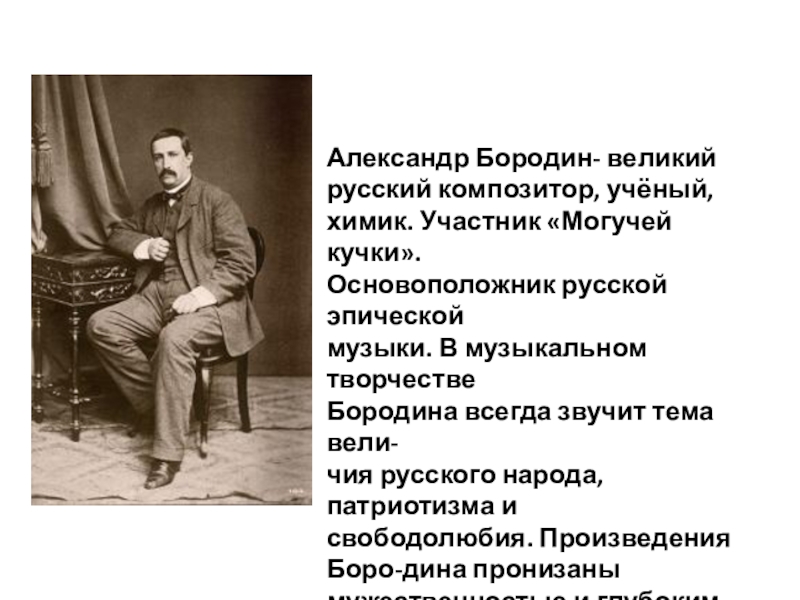 Александр Бородин- великий русский композитор, учёный,химик. Участник «Могучей кучки».Основоположник русской эпическоймузыки. В музыкальном творчествеБородина всегда звучит тема