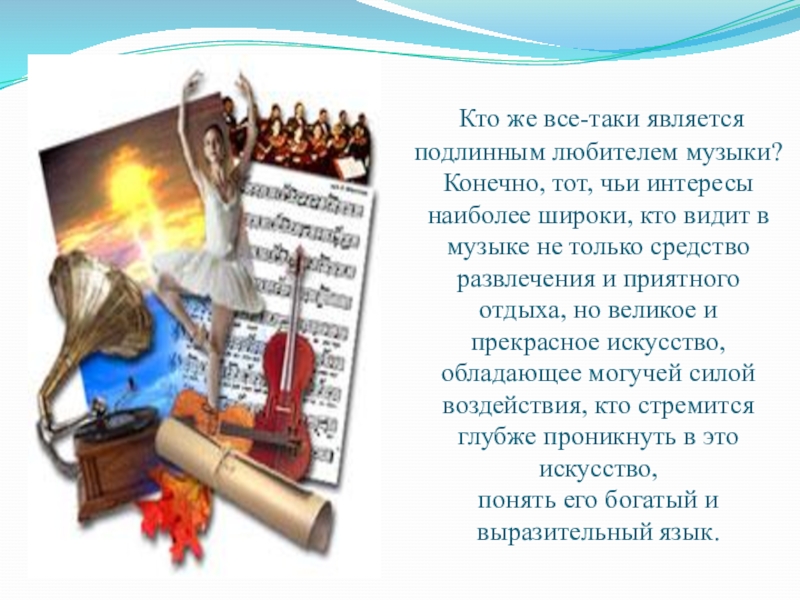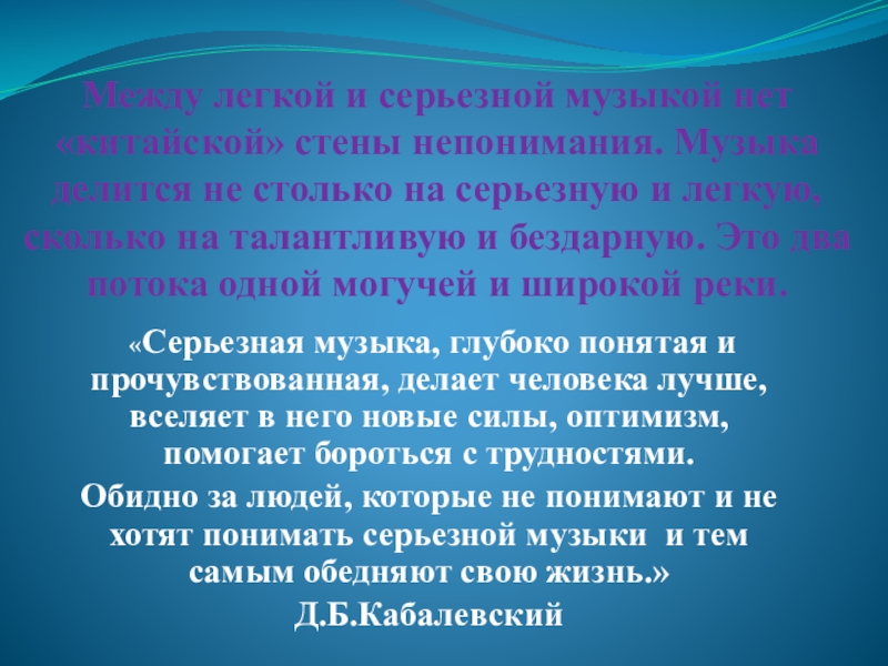 «Серьезная музыка, глубоко понятая и прочувствованная, делает человека лучше, вселяет в него новые силы, оптимизм, помогает бороться с трудностями.