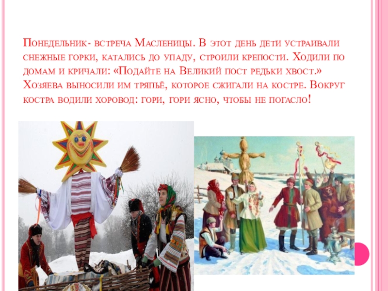 до упаду, строили крепости. Ходили по домам и кричали: «Подайте на Великий пост редьки хвост.» Хозяева выносили им тряпьё, которое сжигали на костре. Вокруг костра водили хоровод: гори, гори ясно, чтобы не погасло!