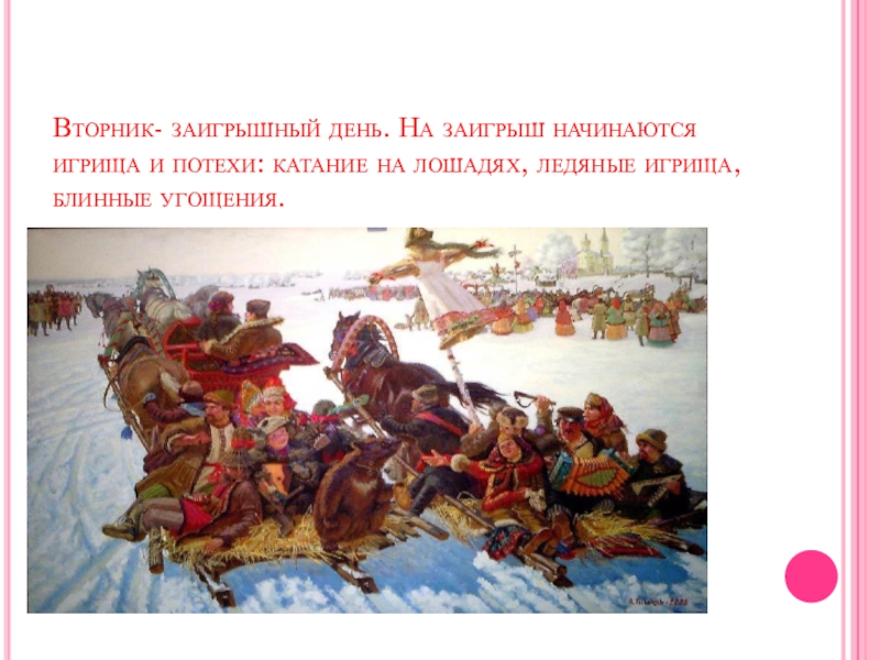 Слайд 4Вторник- заигрышный день. На заигрыш начинаются игрища и потехи: катание на