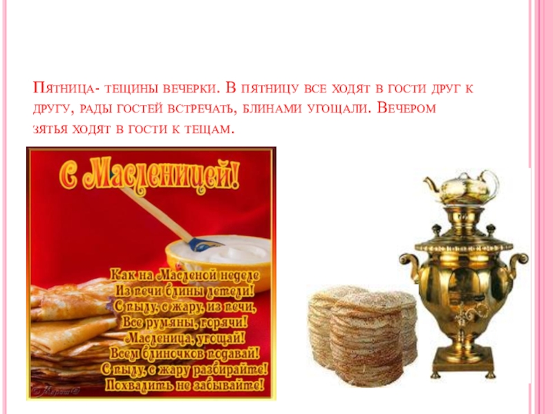 Слайд 7Пятница- тещины вечерки. В пятницу все ходят в гости друг к