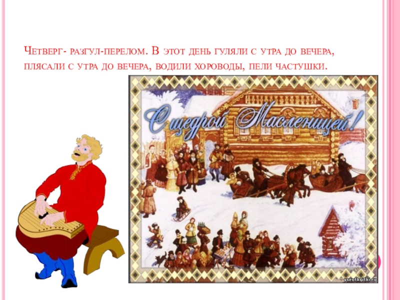 Слайд 6Четверг- разгул-перелом. В этот день гуляли с утра до вечера, плясали