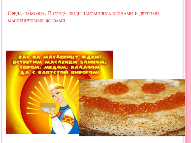 Слайд 5Среда-лакомка. В среду люди лакомились блинами и другими масленичными яствами.