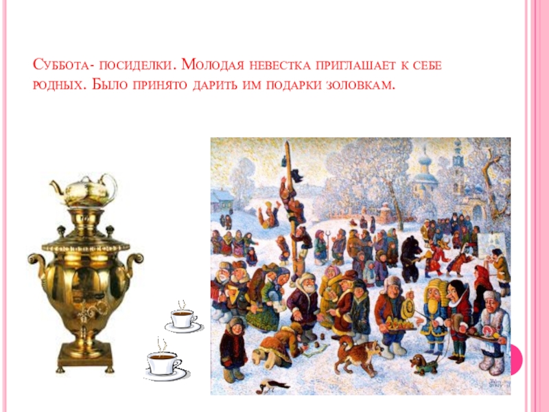 Слайд 8Суббота- посиделки. Молодая невестка приглашает к себе родных. Было принято дарить