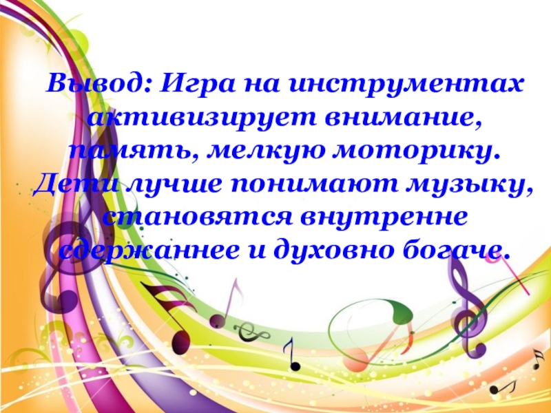 Слайд 7Вывод: Игра на инструментах активизирует внимание, память, мелкую моторику. Дети лучше