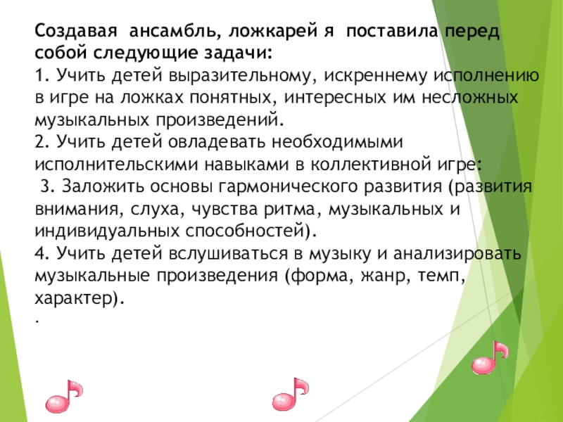 Создавая  ансамбль, ложкарей я  поставила перед собой следующие задачи:1. Учить детей выразительному, искреннему исполнению в игре на