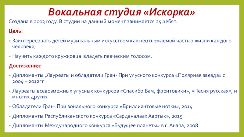 Слайд 5Вокальная студия «Искорка»