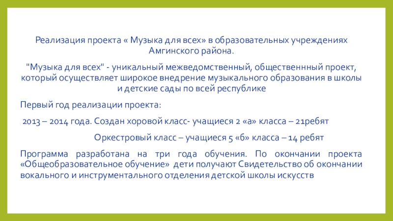 Слайд 25Реализация проекта « Музыка для всех» в образовательных учреждениях Амгинского района.