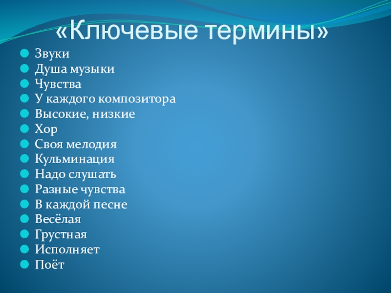 «Ключевые термины»ЗвукиДуша музыкиЧувстваУ каждого композитораВысокие, низкиеХорСвоя мелодияКульминацияНадо слушатьРазные чувстваВ каждой песнеВесёлаяГрустнаяИсполняетПоёт