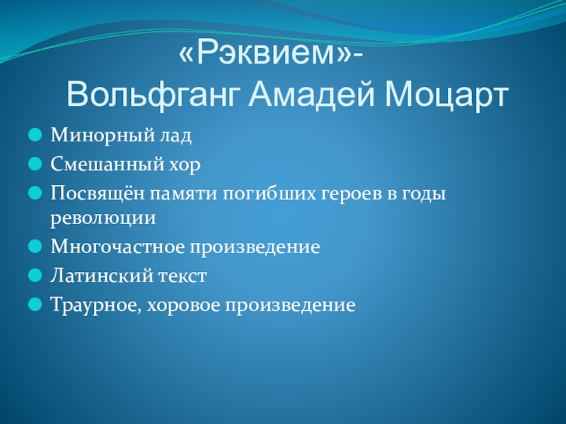 Слайд 10Рэквием- это многочастное хоровое произведение, в исполнении смешанного хора на латинском