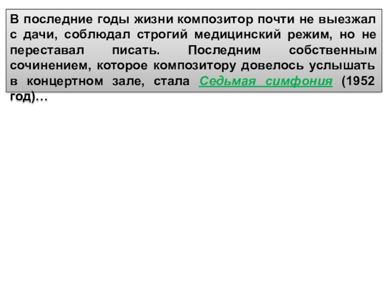 медицинский режим, но не переставал писать. Последним собственным сочинением, которое композитору довелось услышать в концертном зале, стала Седьмая симфония (1952 год)…
