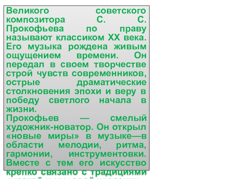 Прокофьев — смелый художник-новатор. Он открыл «новые миры» в музыке—в области мелодии, ритма, гармонии, инструментовки. Вместе с тем его искусство крепко связано с традициями русской и мировой классики.